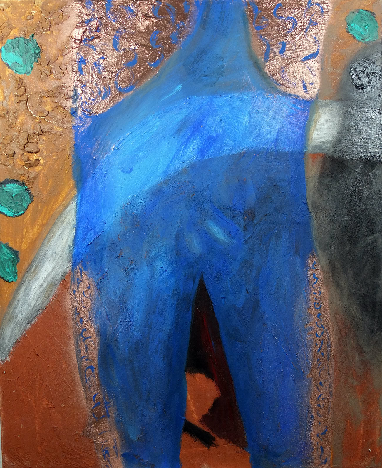 Lorsque nous faisons l’amour, je voudrais me fondre en vous, que nos sangs se rejoignent. Votre sang me fait mal et nourrit mon esprit. Je reste seul et mon corps réclame cette surcharge organique et émotionnelle. Votre sang irrigue mes plus folles pensées. Vous souriez lorsque je vous demande de me photographier recouvert de fleurs. Votre sang me fait pousser des fleurs. Je me couvre de votre sang menstruel. Surchargé de votre sang, je suis une verge en érection. Je nage dans une rivière pourpre. Mon amour est écarlate.