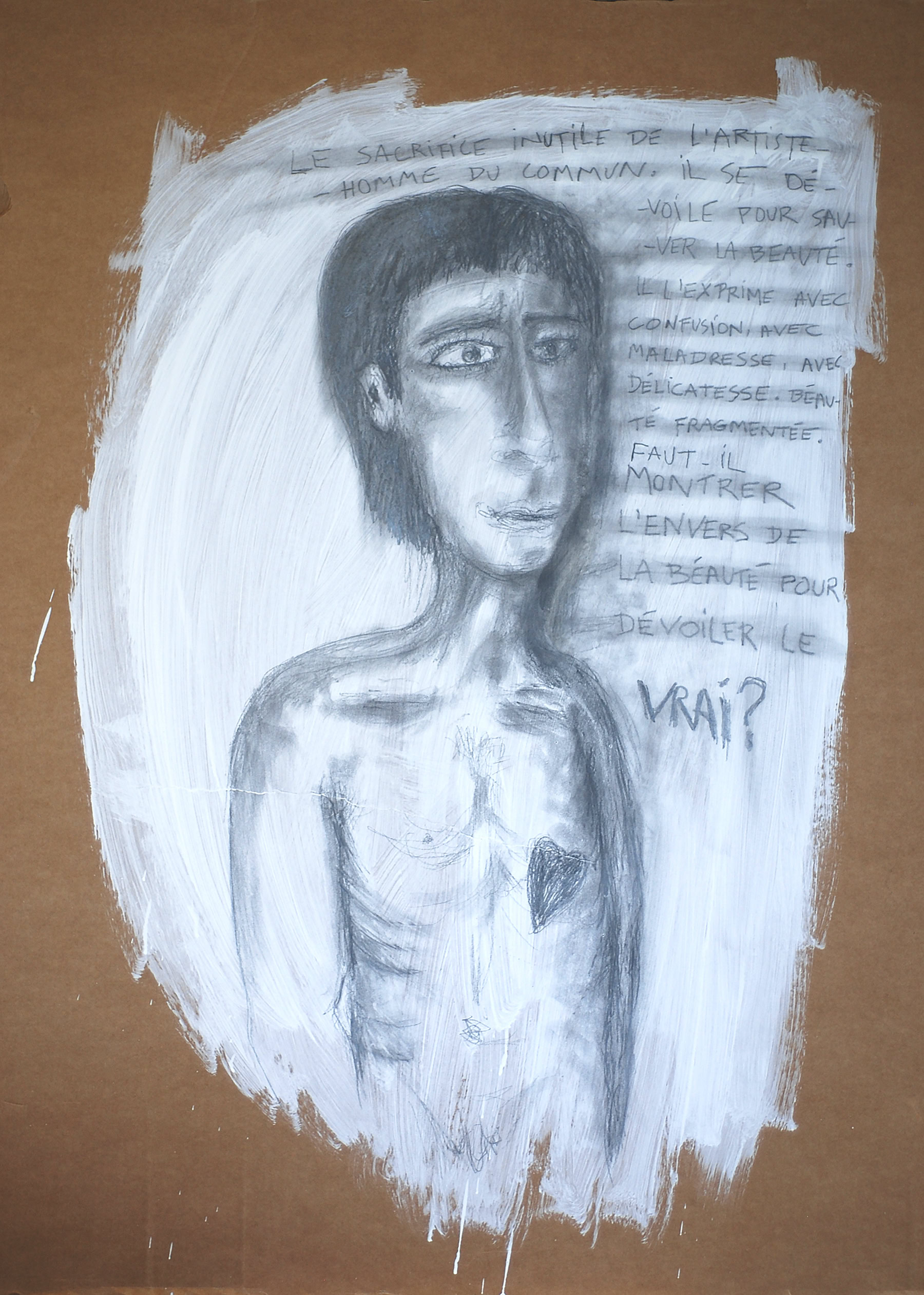 Le sacrifice inutile de l’artiste-homme du commun. Il se dévoile pour sauver la beauté. Il l’exprime avec confusion, avec maladresse, avec délicatesse. Beauté fragmentée.